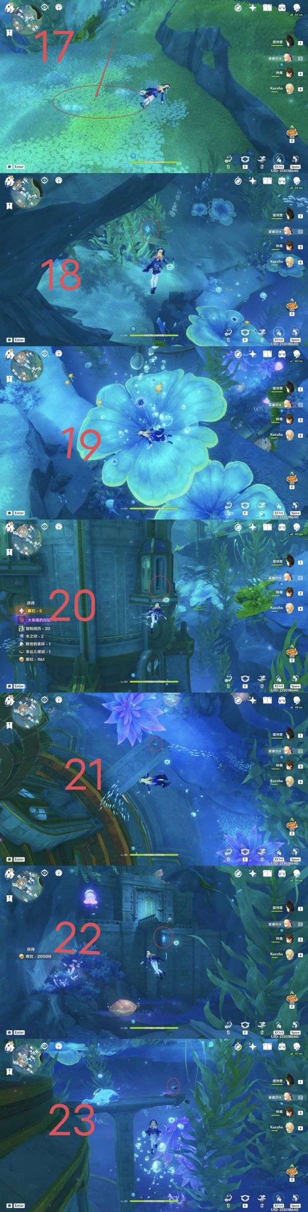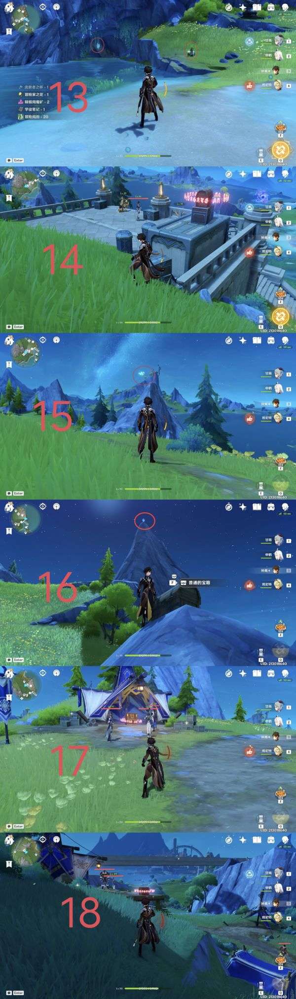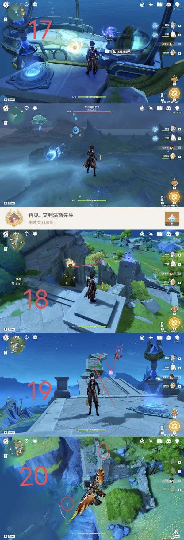 17.华丽宝箱,芒性能量块击打船体启动飞船,飞到终点站跟随传送水环和平台到达,击败「艾利法斯先生」获得宝箱和成就「再见,艾利法斯先生」(这里有一个神瞳,若在任务「水仙的追迹·第二幕」中没有拾取的话可以直接拿);