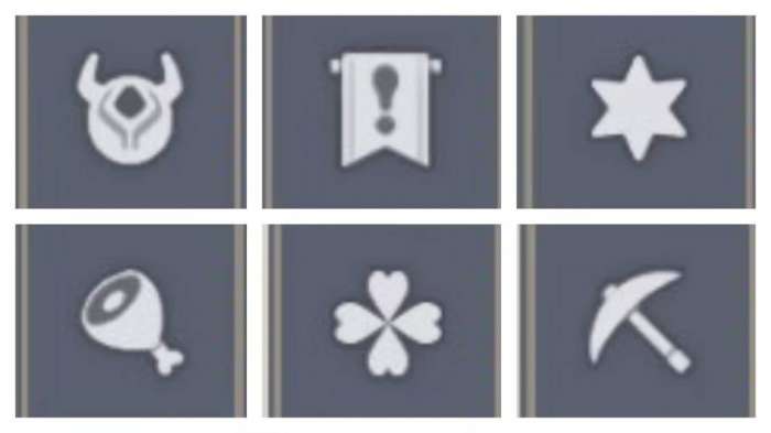 图中地图上以下标记从左往右、从上往下分别作为仙灵、地灵龛、神瞳、限时挑战、宝箱(包含露天、解谜、挖掘、奇馈宝箱等)、摩拉箱。