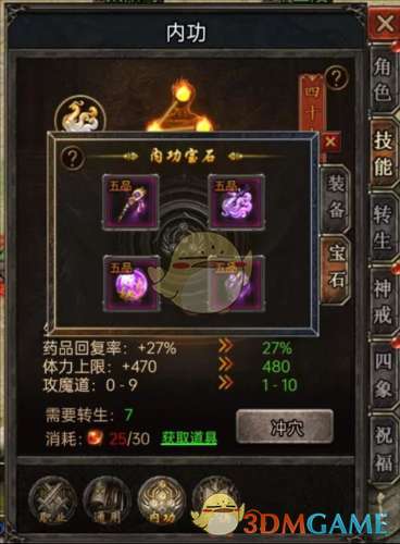 内功系统:提升内功等级除基础属性外还会增加生命回复和药品回复率