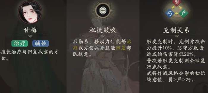 每一场战斗中,玩家都可以充分的发挥甘梅的治疗和辅助作用,这是他所擅长的地方。对我方的士兵进行一系列的治疗后,所拥有的治疗技能也会很快的提升等级。触发克制关系以后,可以迅速将攻击力提升至10%,防守方反击所造成的伤害也能够大大降低到20%,所以在防守以及攻击时,一定要巧妙地利用好人物之间的克制关系。