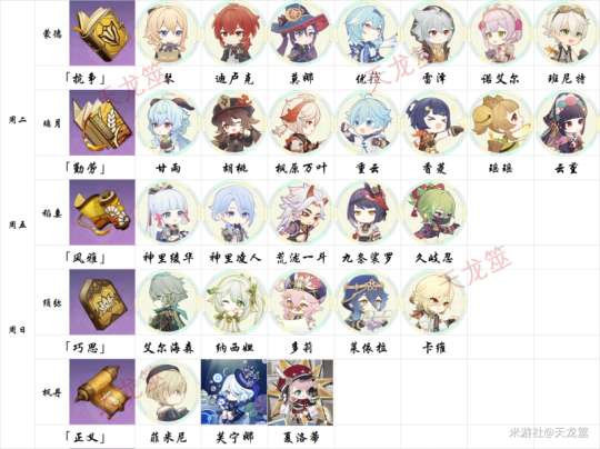 角色:温迪、阿贝多、凯亚、菲谢尔、丽莎、罗莎莉亚、米卡