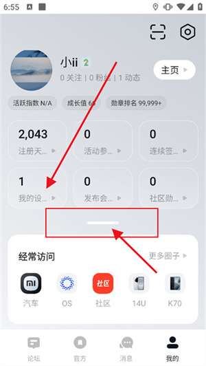 软件提交 专题合集 热门手游小米社区app怎么查看动态,首先,大家可以进入到软件的首页,并找到右下角【我的】页面并继续跳转,接着,找到这个页面中间的横线向下滑动,就能看到设备的选项,如果你想看到自己的发帖信息,点击最上方【主页】,可再次跳转页面。