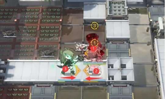 这一关的难度同样也不高,如图所示位置部署塞雷亚 → 艾雅法拉(向左) → 单奶(向右)即可。