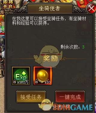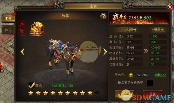 神化成长:使用神化丹,可以使当前的坐骑神化,获得发光特效,同时可以激活额外的坐骑技能。
