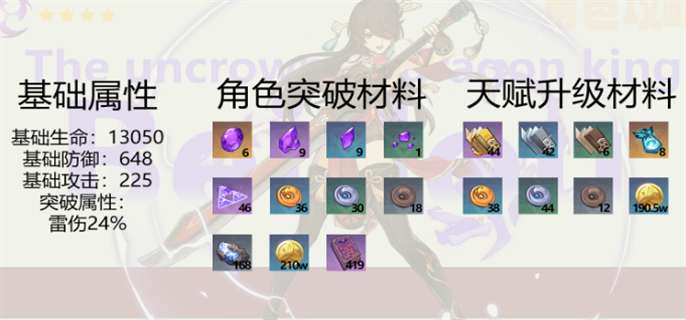 天赋加点1-9-9(打主c可以适当升级普攻),其中雷属性突破素材由40级以上无相之雷、雷音权现、雷属性古岩龙蜥、深海龙蜥之群、掣电树掉落;46个雷光棱镜由无相之雷掉落;鸦印由盗宝团成员掉落;168个夜泊石由璃月山洞、明蕴镇、璃月港商人石头处购买、奥摩斯港商人秋蔚处购买;天赋书黄金为周三、周六、周日在璃月副本太山府产出,8个东风的吐息由周本深入风龙废墟掉落。