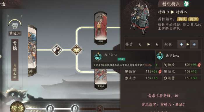 实际上对于一些统帅能力比较强的武将,附属的仕途可以不开启,例如曹操直接开启“雄帅”路线即可,而“于禁”开启战车路线即可。