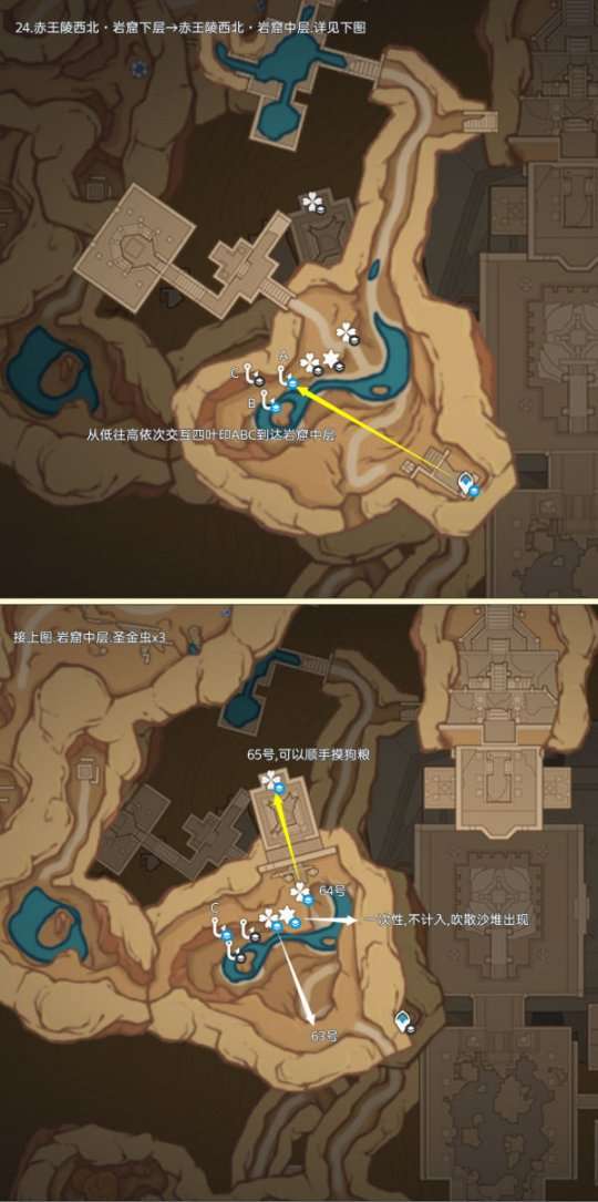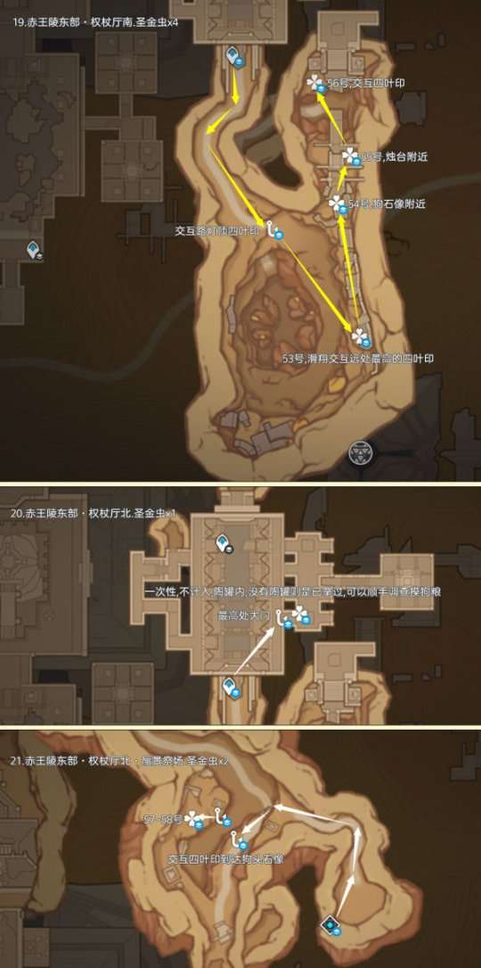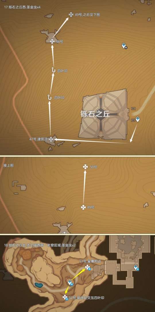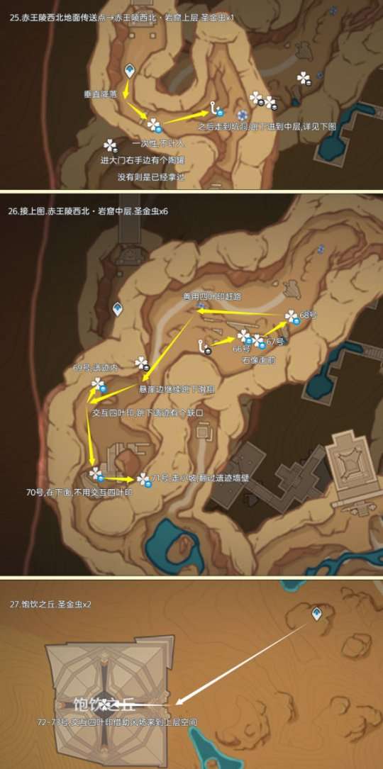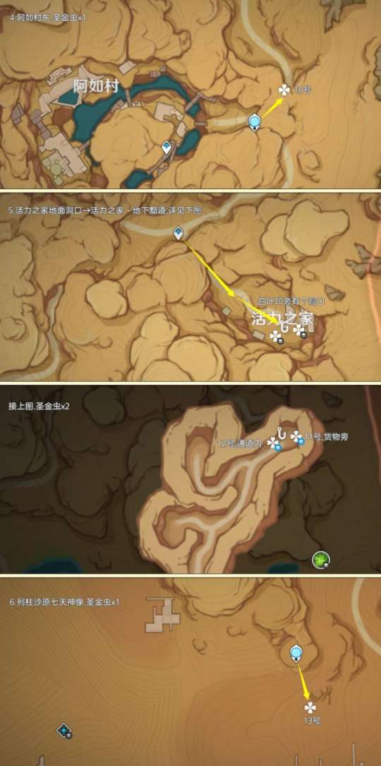 圣金虫点位仅分布在须弥大赤沙海地区,可采集数量为73个,由于圣金虫会来回走动,点位或许有点出入,反正就在附近,多瞧几眼吧;制作路线时尽量遵循从上往下游,视野高好看清,方便旅行者探索。