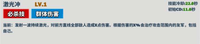 描述: 发射一波持续激光,对前方直线全部敌人造成X点伤害。伤害的X%会治疗攻击范围内的友军,包括自己。
