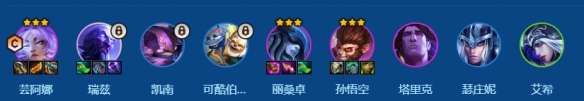 2、在解锁凯南和可酷伯的过渡情况下,快速上8然后抽出2星前排和后排输出阵容成型后稳血上9,补瑞兹大成。