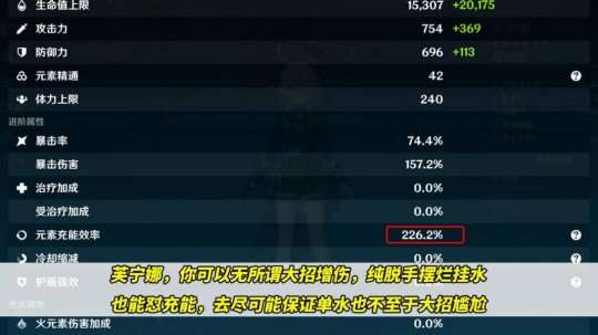 【芙宁娜】可以为全队提供增加伤害的效果,同时她的召唤物可以挂上水产草原核,并且能够输出伤害。如果你在第四个位置上不打算带水系角色,那么芙宁娜必须至少充能220%才能保证对BOSS的输出稳定。如果与行秋或夜兰配合,可以考虑使用充能武器或充能沙,以便替换掉其中一个效果。
