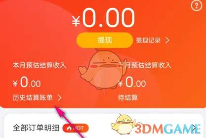 2、仔细浏览界面,在中间位置,查看可提现余额,点击历史结算账单按钮。