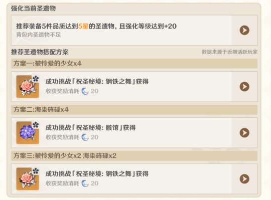第三个,圣遗物推荐,和武器推荐差不多,一样会给出几个方案,大家按照自己现有的圣遗物来做出最接近于指南推荐的圣遗物即可,这样一来练角色也不会茫然了。