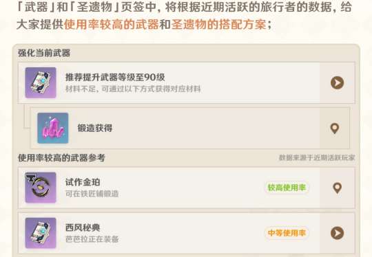 第二个,武器推荐,例如芭芭拉,后续系统会根据全服玩家的出装数据,给玩家推荐当前角色武器使用率排行榜,大家结合自己的武器池子给角色戴上契合的武器即可,个人觉得推荐出装的数据来源还是很可靠的,四星武器确实试作金珀更契合芭芭拉。