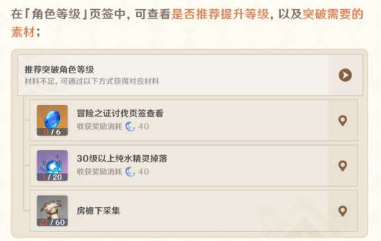 第一个,角色等级,后续玩家可以在这里看到,自己的角色升级突破还需要多少材料,不过这一点是最鸡肋的,因为之前就可以看到了,压根不太需要专门点开这个界面来看,但是新增了一个追踪标志,应该是方便玩家前往该地区收集材料的,也算是一点优化吧。