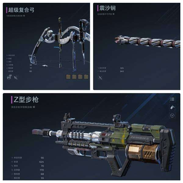 步枪是紫色武器,相对好获取,培养难度低,步枪做为入门首选,可见Z型步枪泛用性相当强。复合弓自带两个技能,主要是一技能进入狂热射击状态,期间使用武器射击会自动消耗后备弹药,且射速提高。震沙锏带技能可以提升角色造成的物理伤害,和步枪十分搭配。