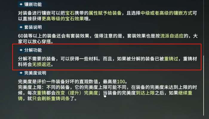 已经被重铸过的装备也可通过该功能进行分解,且分解后会返还重铸资源,降低玩家们资源的消耗量,所以玩家们在拿到装备后可放心重铸,待需要更新换代时再直接将旧的装备重铸。此外,各位也能利用该机制,让好的装备胚子先进行重铸,要是重铸结果满意则直接留下它,如果重制的结果不是自己想要的,便可把它分解掉,令自己能无损筛选出能为自己带来更大加成的装备,在实际游玩时会为玩家们带来很多便利。