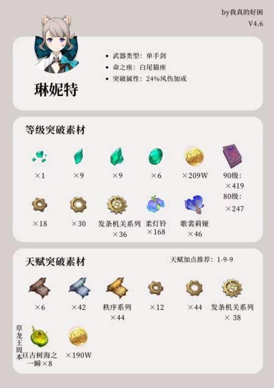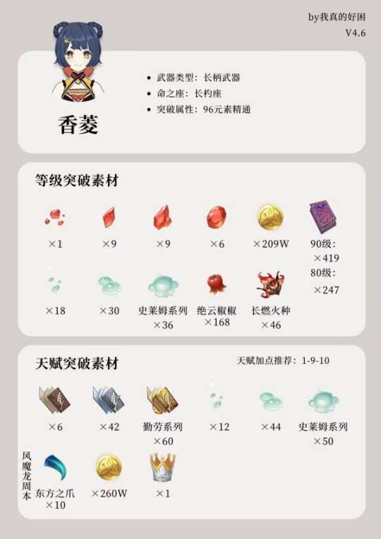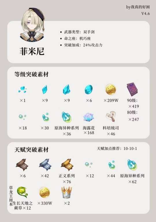 软件提交 专题合集 热门手游各位旅行者,大家好,本期给大家带来的是原神4.6上半up的阿蕾奇诺、林尼、香菱、琳妮特和菲米尼的养成材料统计,希望对大家的角色养成有所帮助。