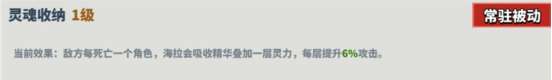 描述:敌方每死亡一个角色,海拉会吸收精华叠加一层灵力,每层提升6%攻击。