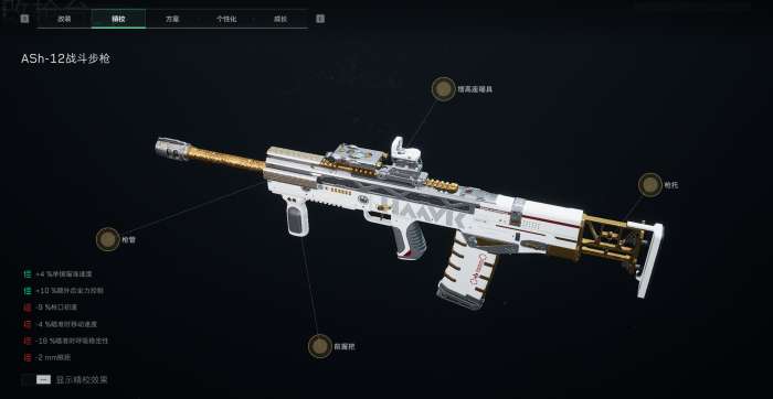 枪管这里我选择是【歼灭高精长枪管】,它可以将Ash-12的第一段射程提升到46米,同时也能增加不少后坐力控制。