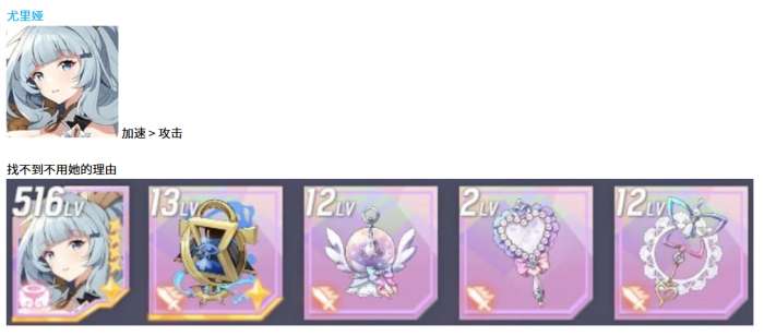 先说尤里娅这个角色,她在天使型里的地位基本上是无可替代的。配装方面主要看两个属性,加速是第一优先级,其次才是攻击力。为什么要这么选呢,因为尤里娅的技能机制决定了她需要频繁出手,加速堆得越高,回合轮转就越快,能够更多次触发她的辅助效果。攻击力虽然也重要,但排在第二位,毕竟她不是纯输出位,主要还是靠技能来带动队伍节奏。装备选择上优先考虑带加速词条的套装,副属性也尽量往加速上靠,这样才能把尤里娅的作用发挥到最大。