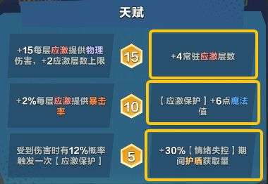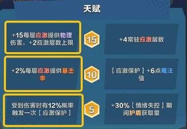 被动·应激保护:每2.4秒获得12层护盾并立即对敌人造成8点物理伤害。每获得100层护盾后获得1层应激。(应激:每层增加6点物理伤害,缩短应激保护间隔0.2秒,可叠加8层,每层独立持续8秒。)