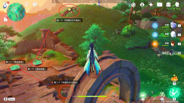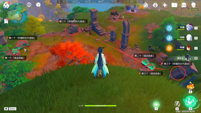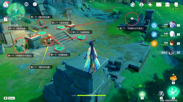 在此处可以看到第二处「古代遗迹」,我们按照下图示意,将周围的「坍塌的古代遗迹」和「慢悠悠仙像」全部放回原位