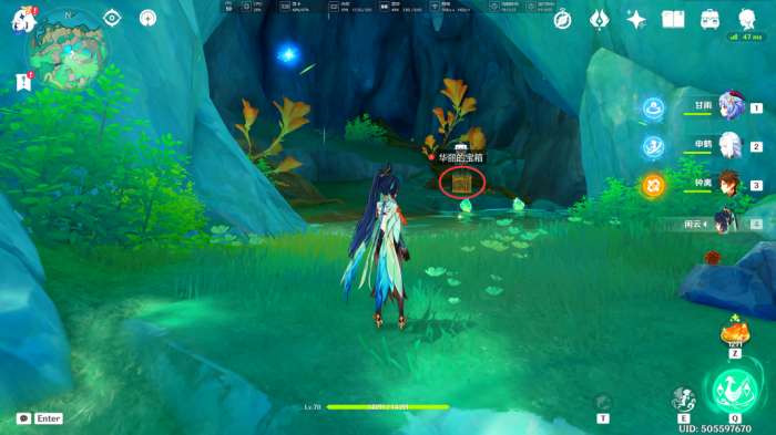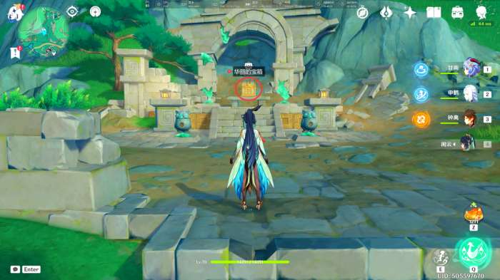 之后我们来到对面的山腰处,洞口的结界解除,同时我们获得一个华丽的宝箱(收集苍灵鲤也需要完成这个「金鲤传送门」的挑战)