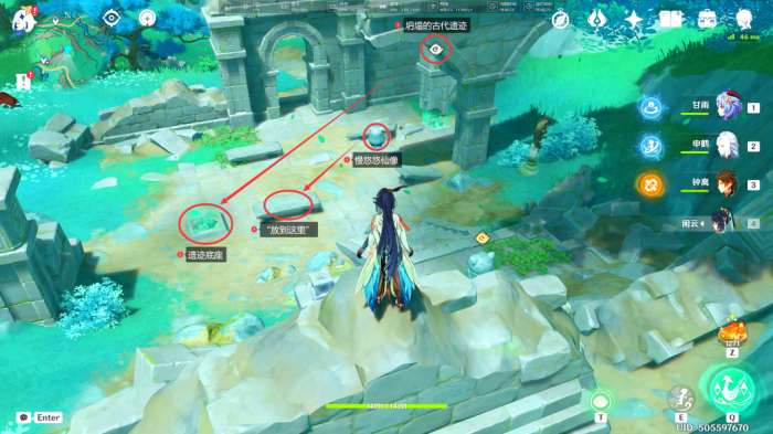 在此处可以看到第一处「古代遗迹」,我们按照下图示意,将周围的「坍塌的古代遗迹」和「慢悠悠仙像」全部放回原位