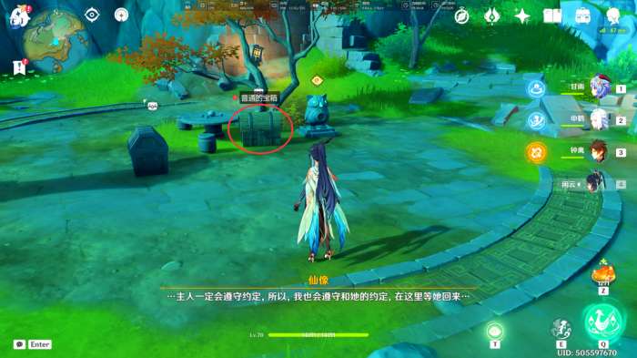 将此处的「古代遗迹」恢复后,会出现一群丘丘人,我们将其全部解决掉(在只剩下丘丘雷兜王时,「气鼓鼓仙像」会助我们一臂之力,在宝箱正上方出现仙力团,运用仙力即可直接击败丘丘雷兜王)