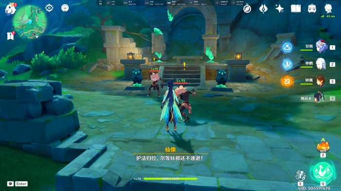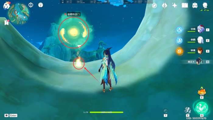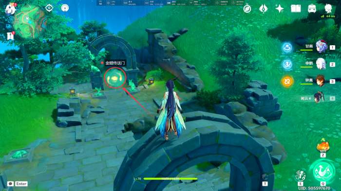 将此处的「古代遗迹」恢复后,拱门下出现一个「金鲤传送门」,我们“激活”其前进(中途要转乘五个「奇妙水珠」继续前进)