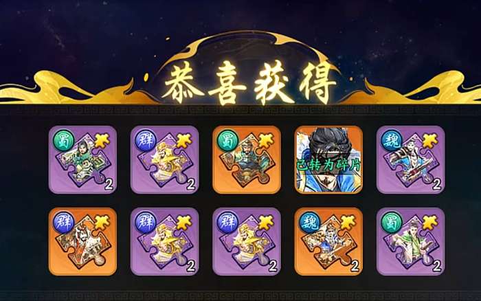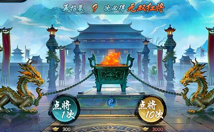 点将台开启后,各位可从府邸功能里找到它,进入后即可抽取武将。它可单抽可十连抽,能抽出红将、橙将和紫将的本体,以及各品级的武将碎片,并且在重复抽出武将本体时,游戏会自动将玩家已经拥有的武将转化为等量的武将碎片,同样的,若玩家拥有的武将碎片数量足够,也可在背包里用碎片来合出武将,已获得的武将无法通过碎片再次合成。玩家们可通过点击武将台界面中的问号标识,来查看各品阶武将及武将碎片的获取概率。