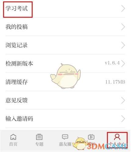 1、在个人中心页面中点击学习考试按钮;