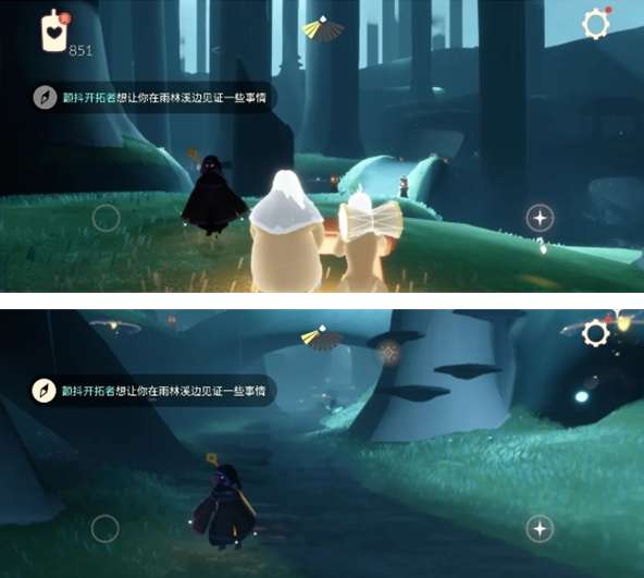 先祖在雨林三图小桥的对面,找到先祖领取任务后到下面的小溪旁等待一会就可以了