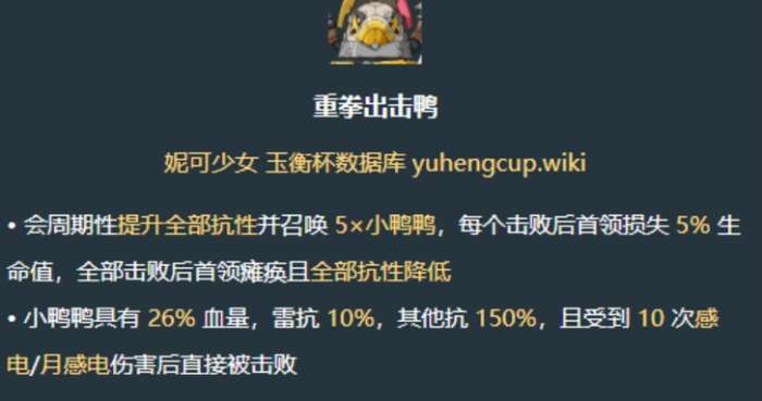 它的机制较为复杂,会周期性地提升全部抗性,这使得玩家对其进行攻击的难度不断增加。同时,它还会召唤5只小鸭鸭,每个小鸭鸭被击败后,首领会损失5%的生命值,当全部小鸭鸭被击败后,首领会瘫痪且全部抗性降低。小鸭鸭具有26%的血量,雷抗10%,其他抗150%,并且受到10次感电/月感电伤害后直接被击败。这就为玩家提供了一个突破口,玩家可以利用感电或月感电反应,优先击杀小鸭鸭,从而削弱首领的实力,为最终击败首领创造有利条件。