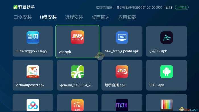4、系统彻底禁止了第三方应用安装,且无法打开(长虹、TCL、创维等电视部分机型都有这个问题)。这个时候就需要借助U盘并利用系统自身的安装功能来安装,插入U盘后,野草助手会把你输入口令的应用下载到U盘中,然后再自行安装。