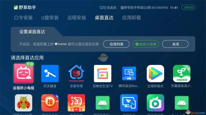 5、桌面直达功能:选择“自定义应用”后,选择一个应用进行“开启”,按home键后即可直接打开刚才选择的应用首页