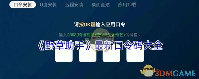 软件提交 专题合集 热门手游野草助手是一款功能强大的智能电视端应用管理工具,用户可以通过输入特定的口令码来安装或管理电视上的各种应用。这些口令码通常由数字和字母组成,且每个口令码都对应着不同的应用或应用组合。下面,小编就为大家带来野草助手口令码最新大全一览表分享。