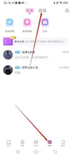 1、进入APP后,首先点击下方“消息”,之后再点击上方的“动态”;