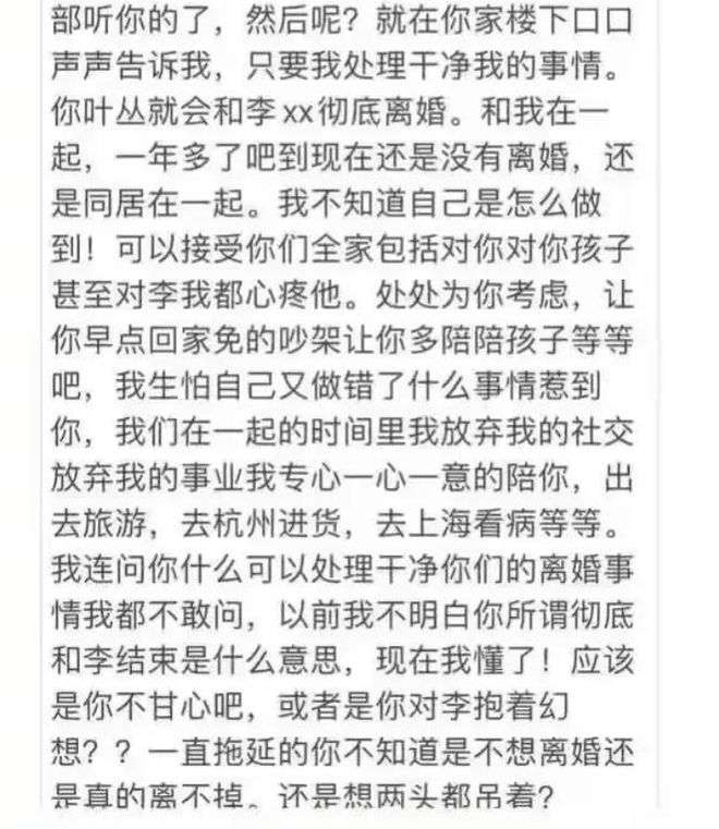 在此期间,小男友处处为叶某考虑,他希望叶某每天早点回家,避免跟老公吵架,他希望叶某整天好好的,孩子也整天好好的,为此,他甚至放弃了自己的事业,放弃了自己的社交,一心一意扑在叶某身上,本以为可以看到叶某离婚,投入自己的怀抱,没想到叶某却迟迟不愿意离婚,她反悔了。