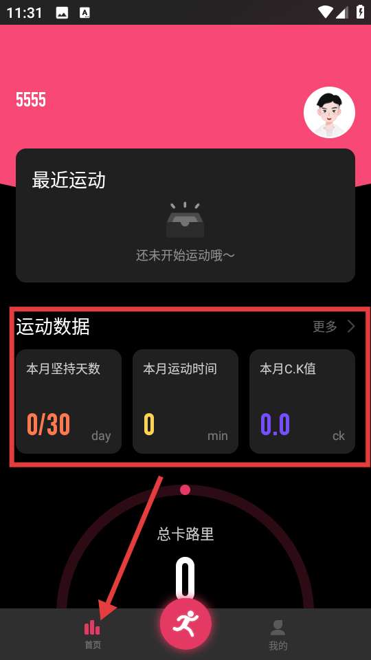 3、首页顶部呈现用户标识与空白运动记录状态,运动数据板块清晰展示本月坚持天数、运动时间、C.K值,底部首页、运动、我的导航方便切换操作。