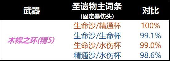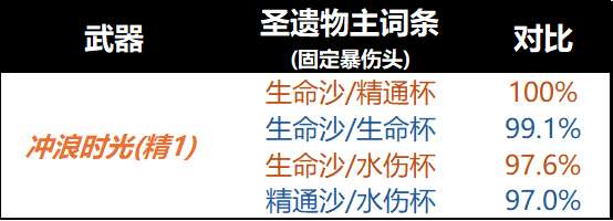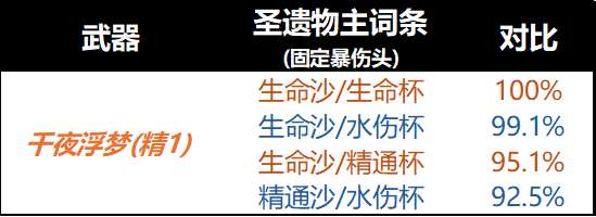 ◆◆◆圣遗物词条选择建议:套装使用[黑曜秘典4件套]时,头部一般都选择暴击伤害,沙漏一般选择生命值,杯子需要根据武器选择,没有精通加成的武器一般选择精通,有精通加成的武器一般选择生命值或水伤,具体可参考上图,需要注意的是,上述均没有考虑队伍有角色使用[圣遗物·教官4],如果有,则精通部位的表现会稍有下降。副词条方面,双暴>精通=生命%。面板方面,精通建议180-280,生命至少32000。