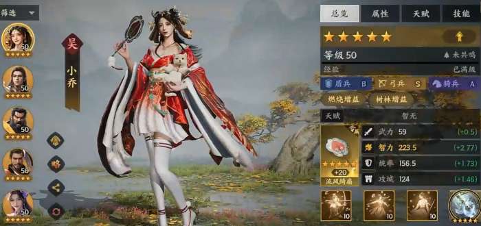 小乔的话在这里可以给我方的部曲带来更多的防御加成,在其中如果燃烧状态可以给部曲带来防御加成的情况下,大家在其中就可以强化部曲自身的攻击能力了,而且小乔同样也是可以针对目前智力最高的武将来进行输出增益的,所以她跟孙权同时都可以给周瑜带来提升的时候,我方就可以用到更多的输出强度,此时大家就要注意小乔自身的增益最好是一开始就用出来,这样整体的输出强度一开始就可以用出来,而另外大家在其中也可以找到更多的替换搭配,比如小乔如果没有拿到,也可以用鲁肃来替代哦。