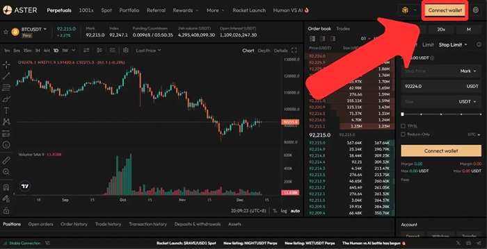 3、连接网站: 进入 Aster 官网,点击右上角“Connect Wallet”。