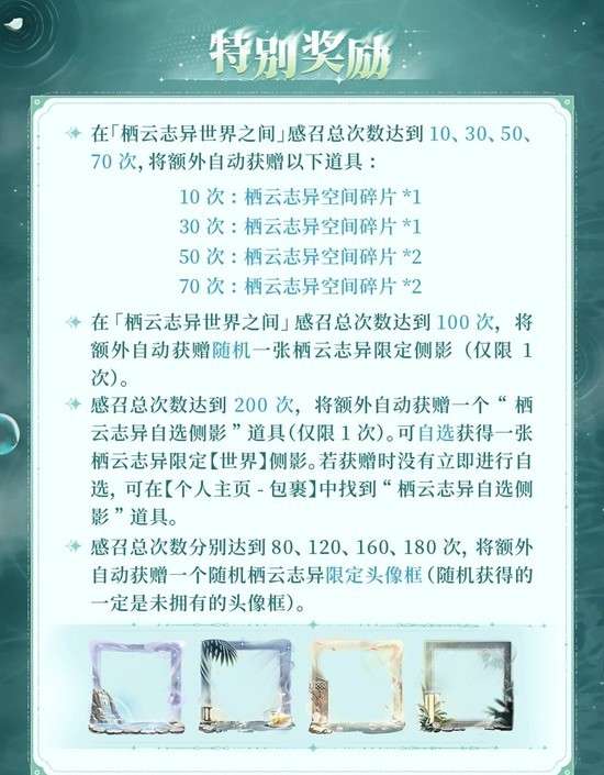 ✦感召总次数达到200次,将额外自动获赠一个“栖云志异自选侧影”道具(仅限1次),可自选获得一张栖云志异限定【世界】侧影。