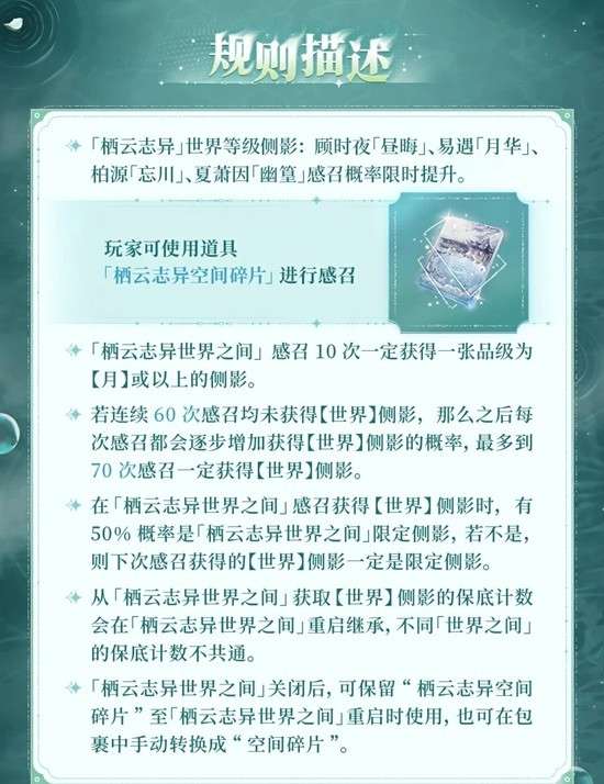 ✦在「栖云志异世界之间」感召获得【世界】侧影时,有50%概率是「栖云志异」限定侧影,若不是,则下次感召获得的【世界】侧影一定是「栖云志异」限定侧影。