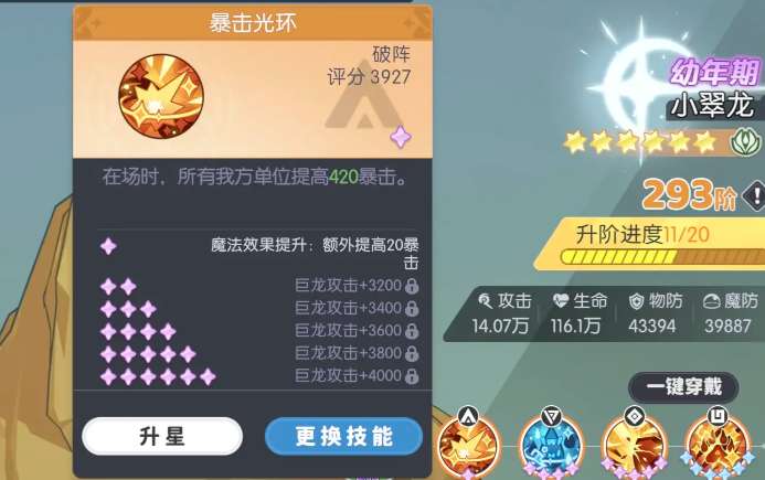 经换算,55.7%基础暴击率叠加42%光环加成后,综合暴击率可达97.7%。这意味着绝大多数攻击均可触发暴击效果,在实战中仅极个别情况出现非暴击判定。为确保该效果稳定达成,需关注两项关键细节:其一,小翠龙需完成深度培养——优先提升龙巢等级,并使其阶数达到293阶,此时暴击光环将额外获得+20暴击值。虽单次增幅有限,但在逼近100%暴击临界点时,此类补充极为关键。