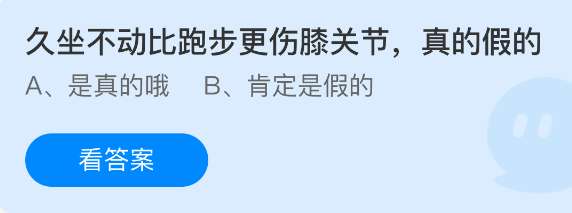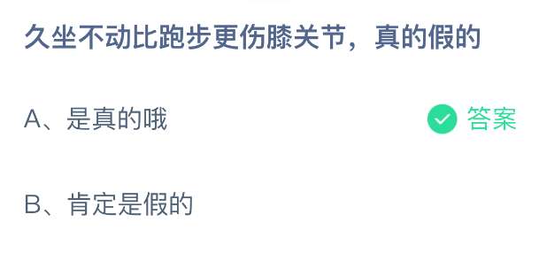 以上就是久坐不动比跑步更伤膝关节,真的假的?支付宝蚂蚁庄园2026年2月12日答案最新,更多相关攻略,请关注pk游戏网更新!