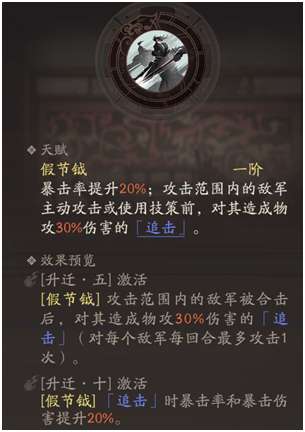 天赋假节钺,暴击率提升20%,攻击范围内的敌军主动攻击和释放技能前可以对其造成一段追击伤害,5星可获得当敌军被合击后也能触发追击(每人每回合一次),满星可以使追击暴击率和暴击伤害额外提升20%,于禁在5星时才算完全体,否则天赋作用几乎可以忽略不计,因此如果想上阵于禁,最好可以拉倒5星,而满星则没有太大必要