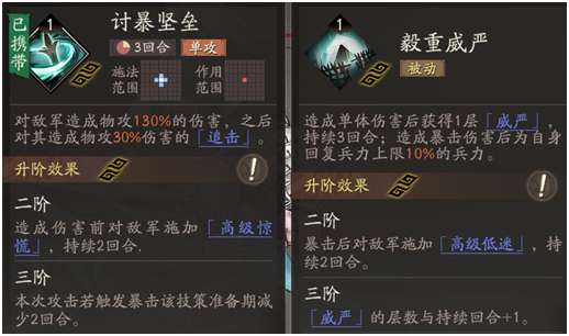 于禁拥有军势技能,需要再上阵两名长兵角色,特殊效果为主动单体攻击时如果敌方无法反击则伤害提升10% 技能简介 核心技能讨暴坚垒与毅重威严,前者是个单体攻击,可以造成追击伤害,升级后造成伤害前可以给敌人施加高级惊慌(被暴击率提升20%)持续2回合,配合天赋和三阶技能特效,可以使于禁轻松暴击敌人而使得该技能变成只有1回合的高伤害单点技能,而后者则是于禁的核心被动,造成单体伤害后获得一层威严(暴击率和暴击伤害提升5%,上限4层),持续3回合,暴击后还能为自己回血,升级后可以使被暴击的敌军施加高级低迷(造成伤害降低20%)持续2回合,且威严的层数和持续回合+1,配合天赋和其他技能,基本上于禁出手就是百分百暴击了,伤害极高