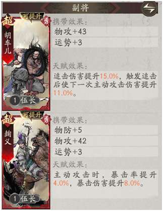 与典韦一样适配胡车儿,进一步强化追击伤害和下一次主动攻击的伤害,而另一个副将可以使用麴义,进一步提升于禁的暴击率和暴击伤害,如果没有的话可以用提升攻击暴击的其他副将来替换